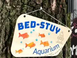 Hand-painted Bed-Stuy Aquarium sign, fixated onto tree beside original aquarium
