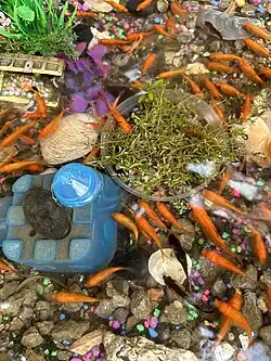 Close-up showing goldfish, aquatic plants, and colorful pebbles in the Bed-Stuy Aquarium