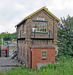 The signal box and the station are actually in Aiskew by parish boundary definitions (the traditional parish boundary was Bedale Beck).[16] However, the signal box was given Grade II Listed Status in February 1993 and as such, it is now in the Bedale Conservation area.[17] The box is believed to have been designed by G. T. Andrews.[18]