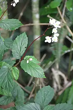 Begonia decandra, the native begonia or corazón de poeta, is a species of flowering plant in the family Begoniaceae, found only in Puerto Rico.[1][2] An understory herb, its veins exude red sap when crushed.[3] The plant prefers low light, with excessive light exposure sometimes leading to death.[4] The white flowers most commonly bloom from April to October.[4]