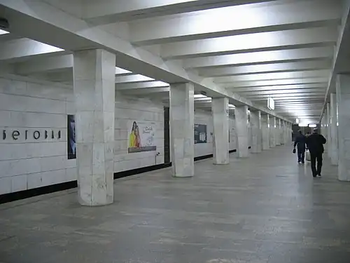 Begovaya (Russian: Бегова́я) is a station on the Tagansko-Krasnopresnenskaya Line of the Moscow Metro. Named after the nearby Central Moscow Hippodrome, the station was opened on 30 December 1972, as part of the Krasnopresnensky radius. Originally the architect V. Cheremin intended to use the typical column tri-span "Novaya Sorokonozhka", but produced a design of pillars starting as a square at the top and octagonally transforming into a square that is at 45 degrees to the top layout. The floor was covered in dark coloured granite and the walls with ceramic tiles, with metallic artworks on the theme of equestrian sports. The station was the first to have repair work done on its walls when the ceramic tiles were replaced by white marble. The vestibules feature a combined escalator/staircase and the top portal is decorated with artwork called "The Mighty Horsemen", all of which along with the wall artworks were created by the artist E. Ladygin. The vestibules are situated next to a junction between 1905 street, the Third Ring Road (originally called Begovaya, hence the name), the Khoroshovo Highway and Rozanova Street. In the tunnel between the Ulitsa 1905 Goda and Begovaya stations there is an access branch that leads into the Krasnaya Presnya depot, which used to serve the Krasnopresnenskaya Line from 1972 until 1975 when the Planernoye depot opened.