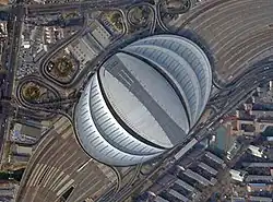 The enormous oval-shaped station was designed by the British architecture firm of TFP Farrells in collaboration with the Tianjin Design Institute.[5] It was built from more than 60,000 tons of steel and 490,000 cubic metres (17,304,000 cu ft) of concrete by 4,000 workers in less than three years. The glass ceiling is outfitted with 3,246 solar panels to generate electricity. The structure spreads out like a ray or trilobite and covers 320,000 square metres (3,444,000 sq ft), more than the Beijing National Stadium's 258,000 square metres (2,777,000 sq ft).[2] Its 24 platforms have the capacity to dispatch 30,000 passengers per hour or almost 241 million a year.[6] The 251,000-square-metre (2,702,000 sq ft) waiting area can accommodate 10,000 passengers.