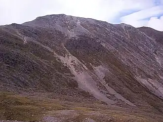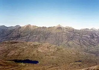 Beinn Liath Mhòr is a Scottish mountain situated in the mountainous area between Strath Carron and Glen Torridon in Wester Ross in the Highland region. Geologically Beinn Liath Mhòr is made up of Cambrian quartzite scree and Torridonian sandstones giving the mountain a distinctive colour contrast of light and dark. The mountain's other main characteristic is its two-kilometre-long undulating summit ridge which does not drop below 800 metres for its entire length. This culminates at the summit at its far western end at a height of 926 metres (3038 feet) making Beinn Liath Mhòr the 258th highest Munro.