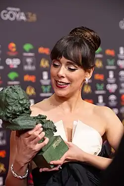 Cuesta looking at her Goya Award for Best Actress for The Endless Trench
