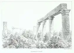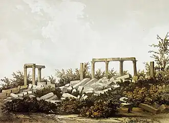 Descriptions of the temple in the mid-19th century describe the remains of 16 columns,[2] with 10 still standing in 1852, of which four on the east and three on the northwest still held architraves with Doric-style capitals.[4] In 1858 when Van de Velde visited, only nine of the columns were still standing.[5] In 1877 when H. H. Kitchener visited, only six columns still bore an architrave.[6]