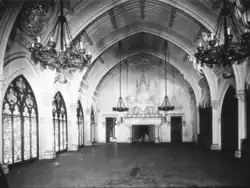 Inside the castle was just as magnificent and somewhat eccentric. Belmont housed his vast collection of horses and carriages on the ground floor, accessed by two huge carriage entrances on either side of the north façade. To the west of this vast area was Belmont's Francis I Renaissance-style Grand Hall and foyer, which exited onto Ledge Road.[7] The monumental Gothic rooms with their huge stained-glass windows were emblazoned with the Belmont coat of arms. The room's original damask, blood red in color, has long since been replaced with the same fabric in gold.
