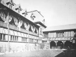 The building was formed of a large quadrangle, with two-story wings connecting to a three-story main block (the north wing). The effect can be viewed today in the form of a large, 80-by-40-foot (24-by-12m) central courtyard with half timbers in the Norman style. The immense mansard roof is pierced by oval copper dormers and chimneys finished in the same manner as the walls. The symmetrical north façade is where the carriage entrances were located. A narrow wrought-iron balcony stretches 70 feet (20 m) on the second floor.
