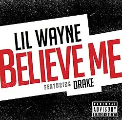 "Believe Me" is a song by American rapper Lil Wayne. It was serviced to urban contemporary radio stations on May 6, 2014, in the United States and was released as a digital download on May 28, 2014.[1] The song features a guest appearance by Canadian rapper Drake.[2] It was released as the intended lead single from Wayne's twelfth studio album, Tha Carter V, however the song was omitted from the tracklist upon the album's delayed release in September 2018.