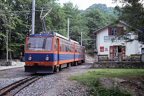In 1867, well before the railway opened, Carlo Pasta built a hotel near to the current location of the Bellavista station. In 1891, shortly after the line opened, a 0.4-kilometre (0.25 mi) long tramway was opened to link the station with the hotel. The line was built to 600 mm (1 ft 11+5⁄8 in) gauge, and used a single, horse-drawn, tramcar. Sources differ on the closure date of the line, with both 1913 and 1938 being quoted.[2][4][5]