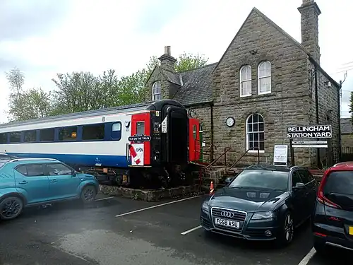 The station opened on 1 February 1861 by the North British Railway. The station was situated near the eastern edge of Bellingham village with the roadside entrance on the north side of Redesmouth Road. It was originally known as Bellingham but the name was changed to Bellingham North Tyne by the LNER to avoid confusion with the station in Lewisham. The goods yard was opposite the platform and consisted of two sidings, the outer loop serving a goods dock which was served end on by a short siding from the loop. The yard had a three-ton crane. The station closed to passengers on 15 October 1956[1] but was still served by excursions until it closed to goods traffic on 11 November 1963. The site of the goods yard is now Bellingham Heritage Centre after it was relocated in 2000. In 2009–10 two carriages from an ex-Southern Region multiple unit were installed alongside the northbound platform to serve as a restaurant ( DTSOs nos. 76301 & 76302 from 4TC unit no. 417 ).[2]