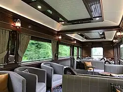 The Grand Hibernian carriages were heavily renovated Mark 3s, originally built by British Rail Engineering Limited at Derby Litchurch Lane Works for Córas Iompair Éireann between 1980 and 1989, and withdrawn in 2009. The carriages underwent extensive engineering redesign and overhaul by Assenta Rail and were refurbished by the company in 2015 at a cost of £7 million.[2] Internal fitting was carried out in Antrim, by Mivan. From the eleven Mark 3 carriages purchased,[2] the train included five sleeping cars, two restaurant cars for dining and an observation car. The train composition and the carriage layouts were inspired by Belmond's other overnight luxury train on the British Islands: the Royal Scotsman. Carriage names were based on the counties of Ireland, several taken from each of the provinces of Ireland. Each carriage bore a dark blue livery, 'Grand Hibernian' lettering, an enamel nameplate, and a 'Celtic knot' logo.