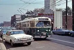 A trolleybus on Belmont Avenue in 1968, passing the Luna Theater, which closed in the 1980s.