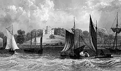 The house was designed as an imitation of a medieval baronial castle with battlements and a four-story tower overlooking the River Thames. Early visitors commented on the luxuriousness and elegance of its interior fittings which matched the neo-Gothic style of its exterior. The library was oval shaped with fitted book cases and mouldings and opened out to a double flight of stone steps descending to a terrace. Its grounds contained a large walled kitchen garden which included fruit trees and a hothouse. Surrounding the house were extensive pleasure grounds, landscaped with forest trees, shrubs, and plants. These terminated on the west side at a Gothic temple and on the east with an orchard and paddock. The house had two approaches: the first from a lodge (also built in the Gothic style) on the south lawn near the road between West Thurrock and Grays, and the second from the north lawn via the road from Stifford village.[10] The estate was situated over a medieval rural settlement and had several dene holes which were covered over during the landscaping of the pleasure grounds.[11]