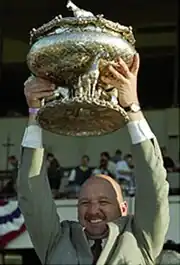 The winning owner is ceremonially presented with the silver winner's trophy, designed by Paulding Farnham for Tiffany and Co. It was first presented to August Belmont Jr. in 1896 and donated by the Belmont family for annual presentation in 1926.