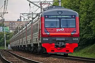 The Belorussky suburban railway line (Russian: Белорусское направление Московской железной дороги) is one of eleven railway lines used for suburban railway connections between Moscow, Russia, and surrounding areas, mostly in Moscow Oblast. The Belorussky suburban railway line connects Moscow with the stations in the west, in particular, with the towns of Odintsovo, Golitsyno, Zvenigorod, Kubinka, and Mozhaysk. The stations the line serves are located in Moscow, as well as in Odintsovo, Ruza, and Mozhaysk in Moscow Oblast. Some of the suburban trains have their eastern terminus at Moscow Belorussky railway station in Moscow, others commute from the Savyolovsky suburban railway line. In the western direction, the suburban trains terminate at Usovo, Odintsovo, Golitsyno, Zvenigorod, Kubinka I, Dorokhovo, Mozhaysk, and Borodino.[1] The line is operated by Moscow Railway. The tracks between Moscow Belorussky railway station and Odintsovo are also used by Line D1, one of the Moscow Central Diameters, and by the service to Sheremetyevo International Airport, provided by Aeroexpress.