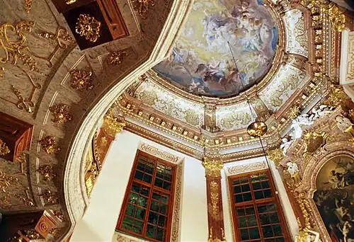 The chapel is decorated in red-brownish and stucco marbling with contrasting white walls and gold gildings. The impression evokes the two marble halls in the Upper and Lower Belvedere. Hildebrandt used the best available artists for the decoration.[1]