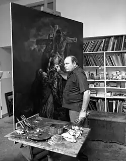 Stahl painted a series of fifteen paintings in the 1950s, commissioned by the Catholic Press. Modeled after the fourteen Stations of the Cross with a fifteenth titled Resurrection, because he wanted the series to end positively, each oil painting was six feet by nine feet (1.8 × 2.7 m).[3]