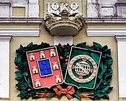 The historical building consists of two floors, in a symmetrical arrangement, with a projecting central body and side wings with two blocks at the ends that also project forward. The facade, in eclectic style with a predominance of neoclassical elements, stands on a small embasement, and a staircase in royal stone leads to the entrance door. The openings are all round arched, separated by Ionic pilasters on the second floor and Corinthian on the second, where there are balconies with wrought iron railings, and an upper finish in an edicule. The building is crowned by a platband with a pediment aligned at the entrance, where a relief shows the coat of arms of the Kingdom of Portugal and the Empire of Brazil, topped by a royal crown, plus the name of the institution - BENEFICENCIA PORTUGUEZA - and the date 1868. Inside, the richly carved staircases and the Noble Hall stand out, with embossed decoration, stained glass windows and a collection of portraits of benefactors.[4]