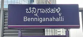 Benniganahalli is an elevated metro station on the east-west Purple Line of Bengaluru's Namma Metro transit system. In its vicinity are the Tin Factory Junction leading towards Baiyappanahalli, the Benniganahalli Lake, and the Tin Factory Bus Stop.[1][2] It was opened to the public on 9 October 2023 without any inauguration ceremony.[3][4]