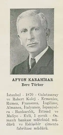 Berç Türker (also known as Berç Türker Keresteci[1] or Berç Keresteciyan Türker; or Berj Kerestejian, Armenian: Պերճ Քերեստեջյան) (1870–1949) was an Ottoman-Turkish bank executive and politician of ethnic Armenian origin.