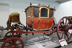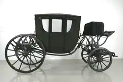A Berlin or Berline carriage is a type of enclosed four-wheeled carriage with two interior bench seats facing one-another.[1] Initially noted for using two perch rails[a] and having the body suspended by leather straps called braces,[b][3][4]: 15 the term continued in use for many carriages even after the suspension system changed to steel springs.[4]: 16