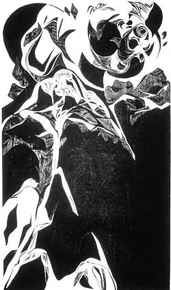 Golahny's early paintings feature a darker palette and rougher line than her later paintings. Much of her early work, such as Street Car Scene, reflects city life in Detroit, New York City, and Chicago: people on buses or trains, workers in factories, and children at play. She blended the abstract and the figurative, often in a given work. Portraiture, including self-portraiture, was a lifelong interest, even as she explored the role of the individual in history and in the cosmos. One series of works, begun around 1964 with a multi-block color woodcut, was titled Landscape of Man in Nuclear Age.[16] The series continued in intaglio, painting, wood engraving, and copper engraving, and was completed in 1988. Golahny repeatedly portrayed human suffering, as in a series of works on the Holocaust.