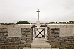Bertenacre Military Cemetery is a British military cemetery with casualties from both world wars, located in the French town of Flêtre in the Nord department in northern France. The cemetery is located about three kilometers north of Flêtre, a few hundred meters south of the road from Eecke to Godewaersvelde, near the hamlet Berthenaere. There are 147 casualties commemorated: 112 from the First World War and 35 from the Second World War. The cemetery is maintained by the Commonwealth War Graves Commission. The site has an area of 716 sqm. A Cross of Sacrifice stands in front.