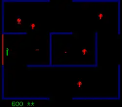 The rooms are littered with robots that move slowly and periodically shoot at the player. The robots can fire in eight directions.[4] The player shoots in the direction of the joystick in one of the eight directions the joystick is placed in. The joystick also controls the Humanoid Intruder's movement. The player cannot move while firing.[3] Bonus points are awarded when each room full of robots is destroyed.[3] A smiley face known as "Evil Otto" will enter from where the Humanoid entered a room eventually and cannot be destroyed. Evil Otto can move through walls and follows the Humanoid Intruder trying to defeat it.[3] Being shot by the robots, touching a maze wall, or having the Humanoid Intruder touch either Evil Otto or a robot will result in the player losing a life.[4]