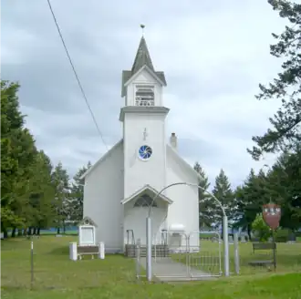 Bethany Memorial Chapel was built by Norwegian homesteaders who settled in the Big Bear Ridge area north of Kendrick in rural Latah County, Idaho. Norwegians who had settled in the area met at the home of Edward Dahl on July 21, 1902, for the purpose of organizing a Lutheran church in the area. In late July 1902, plans were prepared for the building, which was to be constructed on one-half acre of land promised by Edward Jones. However, Jones had sold his land to Halvor Nelson, who then added another one-half acre to the property.[2] Construction of the Carpenter Gothic building began in 1905 and was completed, inside and out, in 1908. Although the interior of the building had not yet been completed, the first service in the church took place on December 26, 1905, when Halvor Lien married Hilda Slind. The pews, altar railing, and pulpit were carved by Eric Leien, a member of the congregation.[3] It was originally named the Evangelical Lutheran Church, Bethany Congregation of Kendrick. There is no longer an active congregation holding services, but the church and cemetery are maintained by community members.[4]