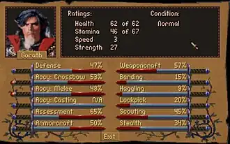 The character system is unique. The main character attributes are health, stamina, speed, and strength. Speed determines how many combat grid squares the character can move. Strength influences the amount of damage the character inflicts in mêlée combat. Spell-casting, swinging one's weapon, and combat damage first use up stamina. Once stamina is depleted, you begin to eat into health. Once it decreases, the character's skills (such as the crucial trait of weapon accuracy), as well as their movement speed, are adversely impacted.