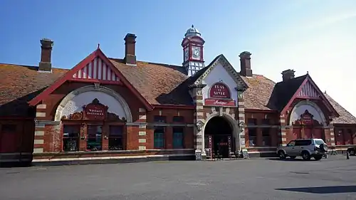 The new Bexhill station was situated in a valley on the west side of Bexhill which had not yet been developed. It was approached by a new road named "Terminus Road" to distinguish it from the "Station Road" which served the LB&SCR's station. A lavish station building was constructed which reflected the SER's ambitions for the line. Designed by C.S. Barry and C.E. Mercer, it was built of yellow and red brick and Bath Stone dressing. Welsh slate was used on the roof which is crowned by a clocktower, and the main entrance features a block-moulded pediment which was carved in situ. The symmetrical building comprised a large and airy booking hall, ticket and parcels offices, a waiting room and ladies toilet, as well as the stationmaster's and inspector's offices. At a right angle to the building stands a smaller block which contained a refreshment room, gents' toilet, porters' and lamp rooms.[6] Two 700-foot-long (210 m) and 30-foot-wide (9.1 m) island platforms were provided, those to the east (nos. 1 and 2) covered by a glass canopy extending to a distance of 400 feet (120 m) and also covering the concourse between the tracks and building. The uncovered platforms 3 and 4 were rarely used; platform 4 never in fact received any track and platform 3 was soon covered by grass. The station buildings were lit by electricity, whereas the platforms by gas. A goods depot was opened on London Road opposite the York Hotel, where a brick shed measuring 133 feet 6 inches (40.69 m) by 30 feet (9.1 m) was erected.[7]