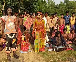 Bhadu gaan, an inseparable part of Bhadu festival reflects the colours of rural society. It used to be very popular in Burdwan, Bankura and Midnapore. But in Birbhum the existence of this unique genre is being threatened by the rising popularity of cinema and television.[4] Bhadu songs are composed extemporaneously and sung on each night of the festival, depicting the Goddesses as young girls. They describe Bhadu and tell in loving detail how they will be entertained. Since Bhadu is unmarried, her songs are sung mostly by unmarried girls. Dancing and playing drums accompanies Bhadu.[5]