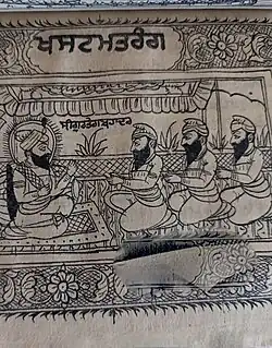 ![]() Illustration depicting Guru Tegh Bahadur and Bhai Mati Das, Bhai Sati Das, and Bhai Dayala, from a Vichar Sagar Steek lithograph, 1881 | |