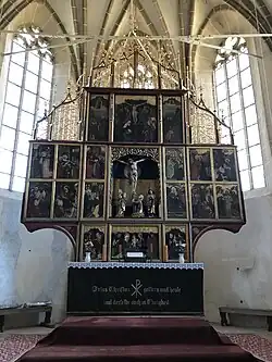 A hall church with three naves that retains a design close to the original,[1][2] it was the last such church built in Transylvania, and was constructed between 1486 and 1524[2] on the site of an earlier Romanesque church.[1][2] Dedicated to the Virgin Mary and built in Late Gothic style with Renaissance touches,[2][3][4] the structure was constrained by the hilly landscape. The choir is 18 m in length, with a rib-vaulted ceiling, while the three naves of equal height also have rib vaulting. A defensive level above the choir has parapets and a battlement.[2] A second, wooden, level was demolished in 1803.[1] The polyptych altarpiece has 28 panels executed between 1482 and 1513 by a painter likely trained at Vienna and Nuremberg. In the center, there is a sculpted group: a crucifix with Jesus Christ hanging, Mary standing and Mary Magdalene embracing the cross. The upper side panels show visions of Ezekiel and Augustus.[2] The stone pulpit, which shows scenes carved in relief, dates to 1523. The richly decorated intarsia door of the sacristy has a complex lock, displayed at the 1889 Paris World's Fair. Its central system blocks the door in thirteen points, ensuring the safety of the valuables kept in the sacristy.[1]