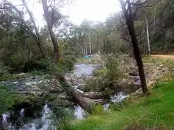 Formed by the confluence of the Springs and Oaks Creeks, the Big River rises in remote state forestry country on the northern slopes of the Yarra Ranges, part of the Great Dividing Range. The river flows generally north, through rugged national park and state forests as the river descends, joined by thirteen tributaries including the Torbreck River and the Taponga River, before reaching its confluence with the Goulburn River within the impounded Lake Eildon, located in the Lake Eildon National Park. The river descends 349 metres (1,145 ft) over its 62-kilometre (39 mi) course.[1]