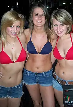 Bikinis Sports Bar & Grill was a chain of sports bars and restaurants located in Texas.[1] The restaurant chain was known for its scantily-clad waitresses, called "Bikini Babes", whose uniforms consist of its eponymous bikini tops, cowboy boots, and tight denim shorts.[2] The chain was also known for trademarking the term "breastaurant" (a common term for this and similar restaurants)[3][4] and purchasing a ghost town that was temporarily renamed "Bikinis, Texas".[5] The chain ceased operations on December 23, 2018.[6]