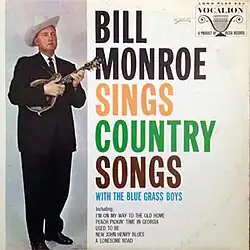 In the fall of 1963, Bill Monroe's manager Ralph Rinzler started researching the history of Monroe's recordings with Decca Records, looking for tracks that had not yet been released.[1] Finding "Peach Pickin' Time in Georgia" from 1951, "Used to Be" from 1955 and "When the Phone Rang" from 1959, he arranged for the production of Bill Monroe Sings Country Songs to be released early the next year by Vocalion Records, a subsidiary of Decca which primarily released retrospective material. According to future Blue Grass Boys member and Monroe biographer Tom Ewing, Rinzler "undoubtedly" chose the rest of the songs that would make up the compilation, which he described as "several old favorites".[2] Bill Monroe Sings Country Songs was released by Vocalion on March 2, 1964.[3]