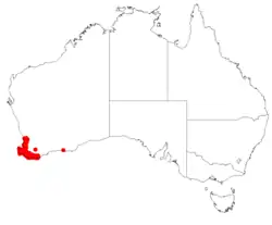 White-flowered billardiera grows in forest and woodland from near Perth and south to Augusta then east to Albany and the Porongurups in the Jarrah Forest, Swan Coastal Plain and Warren bioregions of south-western Western Australia.[2][3]