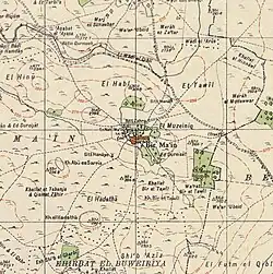 1870s map 1940s map modern map 1940s with modern overlay mapA series of historical maps of the area around Bir Ma'in (click the buttons) | |