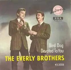 "Bird Dog" is a song written by Boudleaux Bryant and recorded by the Everly Brothers.[4] It was released in 1958 and was a No. 1 hit on the Billboard Country Chart for six weeks.[5] The song also hit No. 2 on the U.S. Billboard Hot 100 (stalled behind Domenico Modugno's "Nel blu, dipinto di Blu (Volare)" and Tommy Edwards' "It's All in the Game"), as well as peaking at no. 2 for three weeks on the R&B charts.[6]
