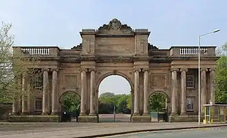 The Grand Entrance is at the northeast entrance to Birkenhead Park. It consists of three arches flanked by lodges and is in Ionic style. The entrance was designed by Lewis Hornblower, with amendments by Joseph Paxton, the designer of the park. The park, and its entrance, were opened in 1847. The Grand Entrance is recorded in the National Heritage List for England as a designated Grade II* listed building.[17]