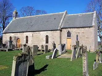 Birnie Parish Kirk is a rare 12th century Norman parish church located 4 km south of Elgin, in Moray, Scotland. Birnie is one of the oldest churches in continual use in Moray. It is thought that the Norman building was built to replace an earlier, 6th century, Celtic kirk. The presence of a Pictish symbol stone suggests Birnie had been a pre-Christian holy site from very much earlier. It is constructed of aislar (ashlar), a finely cut freestone. The building is rectangular with a square, short chancel, which is separated from the nave by a rounded Norman chancel arch. The nave was shortened in 1734 when the wall was rebuilt, and the kirk was later restored in 1891. In the chancel is what is believed to be a Celtic bell, said to have been made in Rome and blessed by the then pope. There is also a 17th century bible, covered in calf's fur - locally known as the Hairy Bible. In the corner of the nave stands a plain, Romanesque style font. The church contains lancet windows in the north and south.[2]