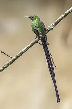 The black-tailed trainbearer (Lesbia victoriae) is a species of hummingbird in the family Trochilidae. It is found between 2500 and 3800m in Colombia, Ecuador, and Peru. Its natural habitats are subtropical or tropical moist montane forest, subtropical or tropical high-altitude shrubland, and heavily degraded former forest.