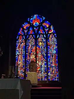 The nave leads to the altar below the tower. At the end of the South transept is the large stained glass window known as the "Rosary Window", which is composed of five "lights" or great vertical panels, and is the largest stained glass window in Ireland.[2] This window was created in 1892 by Mayers of Munich, and depicts the Mysteries of the Rosary.[4]