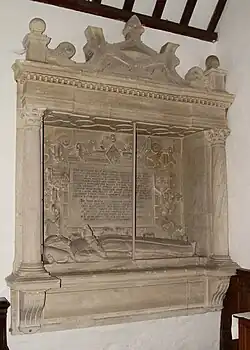 The Church of England parish church of Saint Mary the Virgin was originally built about 1190.[2] The five-bay arcade between the nave and north aisle survives from this time. In the 13th century, the chancel, nave and north aisle were remodelled, and the easternmost bay of the aisle was projected northward to form a north transept.[2] Early English Gothic lancet windows in chancel, nave and north chapel date from this time. The north doorway of the north aisle dates from the 14th century. In the 15th century, the bell tower was built into the nave and the stone pulpit was built.[2] By the end of the 16th century, the north transept had become the memorial chapel of the Hungerford family. Built into the north wall is a substantial stone monument to Eleanor Hungerford (died 1592): a recumbent effigy framed by Corinthian columns. The chapel also includes an English Baroque cartouche to Anthony Hungerford (died 1703) on the west wall.[2] Black stone plaques on the floor record other members of the family.