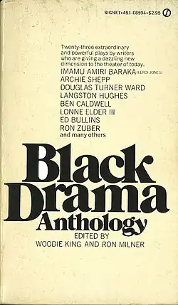 Black Drama Anthology is a 1971 collection of plays solely written by Black American playwrights. The anthology was edited by Woodie King Jr, a Black American stage producer and Ron Milner, a Black American playwright. Writer Langston Hughes, Jazz musician Archie Shepp and writer Imamu Amiri Baraka appear in this collection, among others. Black Drama Anthology opens with a foreword by the editors King and Milner which outlines the motivations behind this collection, in which they write, "...recognizing all of this, and understanding that if we blacks are to have a theater in our own image, according to our own views, then we blacks will have to say which plays are in those images and of those views, we have here compiled an anthology of works by twenty-two of the best black playwrights...Twenty-three selections from an immensely rich field of talented black artists forging new, unique, and viable theater."[1]
