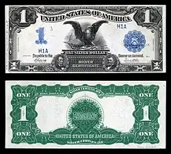 The one-dollar silver certificate was issued by the United States in 1899.[7] The first Black Eagle notes began arriving at banks in January 1899.[7] When the BEP identified mistakes in the printing of the 1899 Black Eagle, they printed replacement notes that had a star preceding the serial number on the obverse. There are 13 varieties of the 1899 Black Eagle; the value of the note to modern-day currency collectors is dependent on both their condition and whose signature appears on the note.[15]