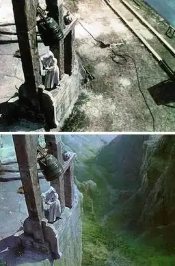 The film is known for making extensive use of matte paintings and large-scale landscape paintings (credited to W. Percy Day) to suggest the mountainous environment of the Himalayas, as well as some scale models for motion shots of the convent.[21] Powell said later: "Our mountains were painted on glass. We decided to do the whole thing in the studio and that's the way we managed to maintain colour control to the very end. Sometimes in a film its theme or its colour are more important than the plot."