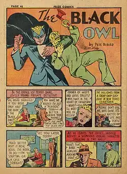 In 1940, Prize Publications, which was already established as a producer of pulp magazines, began publishing superhero comic books with a new title, Prize Comics. The first issue featured "K the Unknown", whose name was changed to the Black Owl in issue #2 (April 1940).[1] The lead character, like many in superhero comics at the time, was a bored, wealthy sophisticate who fought crime to pass the time.[2]