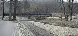 After 500 metres (1,600 ft), the stream reaches the German-Czech border at the old road between Přísečnice (Preßnitz) and Kalek (Kallich) and flows through the Satzung municipal pond (Satzunger Gemeindeteich). From here on, it forms the national border for 13 kilometres (8.1 mi), as far as the village of Kühnhaide (a district of Marienberg). In this section it passes the villages of Satzung (the former village of Ulmbach (Jilmová) on the Bohemian side opposite was demolished in 1945) and Reitzenhain (the village of Pohraniční, that used to be on the Bohemian side, was also abandoned).